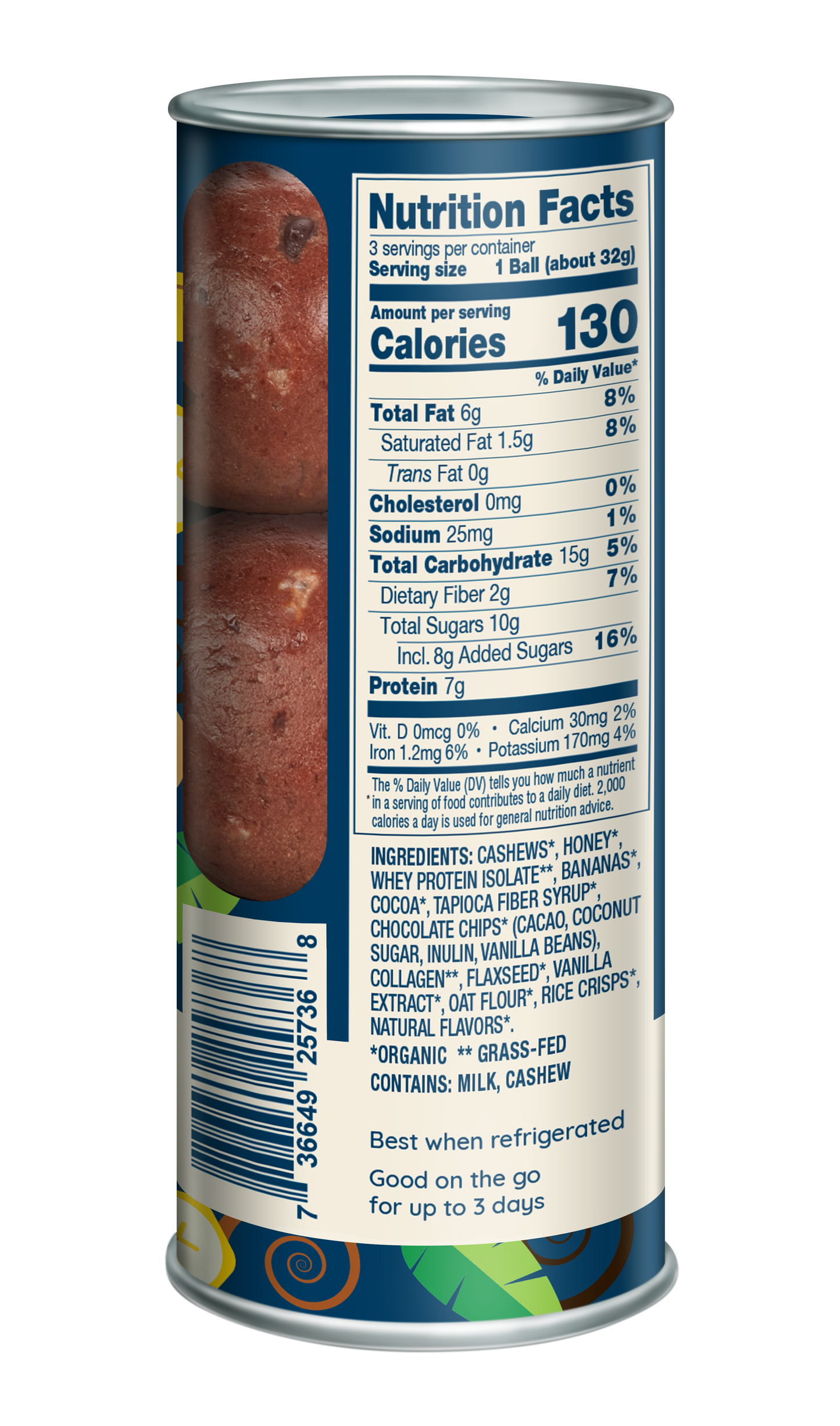 We took real bananas, rich cocoa, and paired them with velvety cashew butter and grass-fed protein to create a snack that hits the sweet spot—without the sugar crash. Each bite delivers nostalgic banana bread flavor with a chocolatey twist, all wrapped in a clean-label, fridge-fresh energy ball that actually tastes homemade.